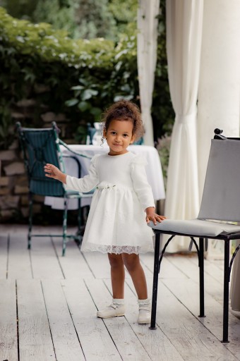 Delikatna sukieneczka w kolorze ecru. Jedyną ozdobą sukieneczki jest śliczna koronka na ramieniu w formie skrzydełek, oraz na spódnicy, nadająca elegancji. Z tyłu sukieneczka zwężana kokardą. Sukieneczka starannie wykonana z dbałością o detale.