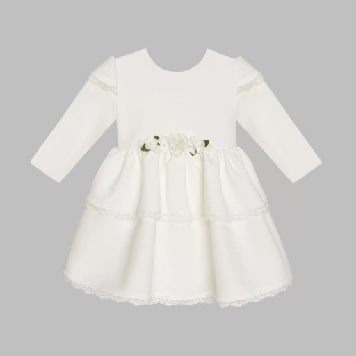 Delikatna sukieneczka w kolorze ecru. Główną ozdobą sukieneczki jest śliczna koronka na ramieniu w formie skrzydełek, oraz na spódnicy, nadająca elegancji. W pasie umieszczono bukiecik. Z tyłu sukieneczka zwężana kokardą. Sukieneczka starannie wykonana z dbałością o detale.