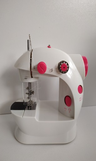 - Zabawkowa maszyna do szycia posiada 2 poziomy szybkości pracy, nić górną i dolną, opuszczany trzpień do nawijania szpulek, zapasową igłę i wiele więcej