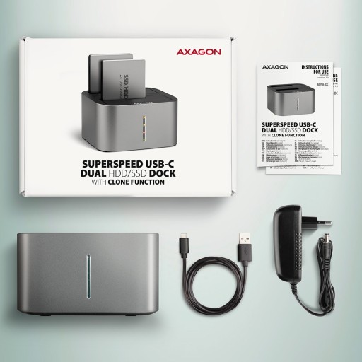 Stacja dokująca / klonująca SuperSpeed USB-C 5Gbps AXAGON ADSA-DC DUAL CLONE łatwo i szybko podłączyć do komputera dwa dyski 2.5 lub 3.5" jednocześnie. Podłączenie do komputera umożliwia złacze nowoczesnemu dwustronnemu złączu USB-C w stacji dokującej, wraz z dołączonym 80 cm kablem USB-C USB-A o długości 80 cm.