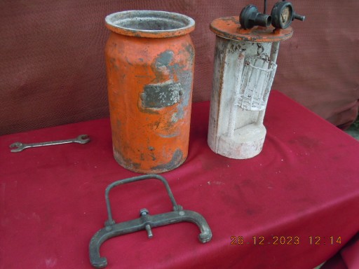 Przedmiotem licytacji jest ORYGINALNA wytwornica acetylenu z okresy II wojny światowej . wewnątrz cylindra znajdował się zbiornik z wodą oraz w drugiej połowie koszyczek z regulowaną za pomocą śruby wysokością. do koszyczka wkładało się karbid i w zależności od wielkości zanurzenia w wodzie produkowało się więcej lub mniej gazu ACETYLEN. jak widać urządzenie w miarę kompletne, sprzedaje jako przedmiot kolekcjonerski, ale gdyby się ktoś uparł myślę że dałoby się go uruchomić. gorąco polecam. na innych aukcjach wystawiam więcej ciekawych przedmiotów. cena zawiera cło dla allegro, może być taniej. proszę/o/kontakt/509/716/559!!! Gorąco polecam .Proszę o rozważne licytowanie i poważne podejście do zakupu . Po to zamieszczam tyle zdjęć, żeby licytujący wiedział co kupuje. Jeżeli czegoś nie jesteś pewien pisz, postaram się jak najszybciej odpowiedzieć. Gorąco polecam i życzę powodzenia!!!! na moich innych aukcjach więcej ciekawych przedmiotów . ZAPRASZAM NA INNE MOJE AUKCJE. zwrot możliwy na warunkach zawartych w formularzu, ale dodatkowo od kwoty zwrotu odliczam koszty wysyłki od klienta do mnie w obydwie strony. jeżeli komuś to nie odpowiada, proszę nie licytować. niestety nie jestem sklepem i za wszystko muszę sam płacić. oryginał 100%