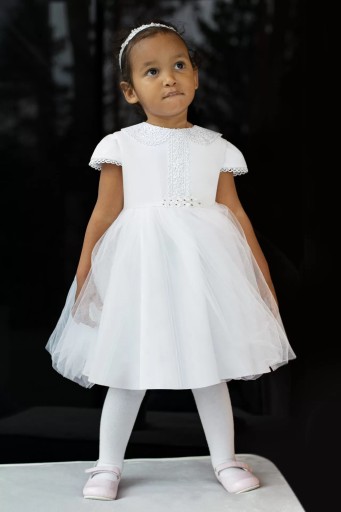 Sukieneczka z tiulową spódnicą, oraz elegancką koronką widniejącą przy dekolcie, na ramionach, oraz przy rękawkach. Uroku nadają kwiatuszki widniejące w pasie sukieneczki.