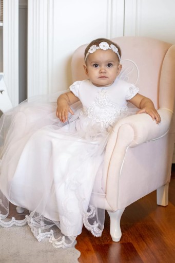 Ekskluzywna sukienka w stylu angielskim w kolorze białym. Spód sukienki wykonany z jedwabiu z dodatkiem satyny. Bardzo miły w dotyku. Na wierzchu pokryty piękną koronką. Całość niezwykle wytworna, unikatowa.
