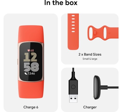W zestawie: Tracker Fitbit Charge 6 (w zestawie paski w rozmiarze małym i dużym). Paski na nadgarstki mierzą małe 140 mm–180 mm z dodatkowymi dużymi 180 mm–220 mm. W zestawie także ładowarka (kompatybilna z Fitbit Charge 5, nie kompatybilna z innymi modelami)