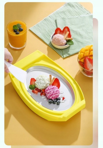 ŁATWY W UŻYCIU: Umieść patelnię w zamrażarce na 12 godzin przed użyciem, nałóż jogurt lub mieszankę mleka na tacę, odstaw na 5~8 minut, a następnie rozwałkuj lody łopatką