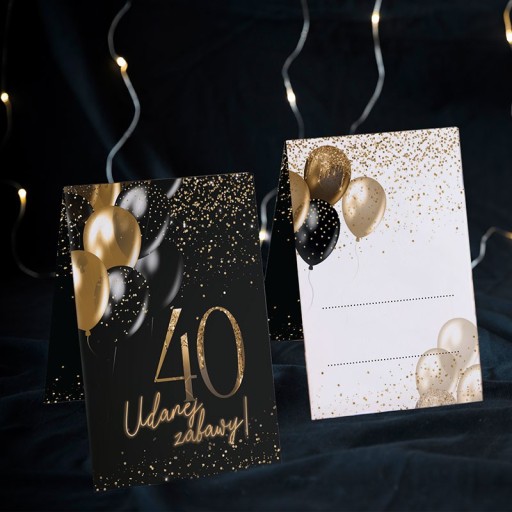 Winietki na 40 urodziny to świetny wybór, jeżeli planujecie rozsadzić gości i pięknie udekorować stół. Winietki zdobione są nadrukiem czarno-złotych balonów, posiadają miejsce do samodzielnego wpisania nazwisk gości. To wspaniała propozycja na imprezę w modnym stylu w czarno-złotym wydaniu.