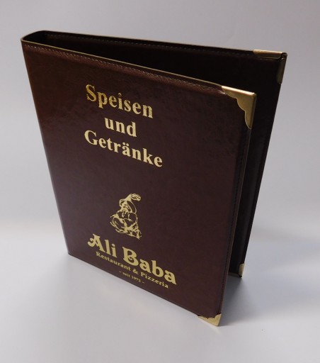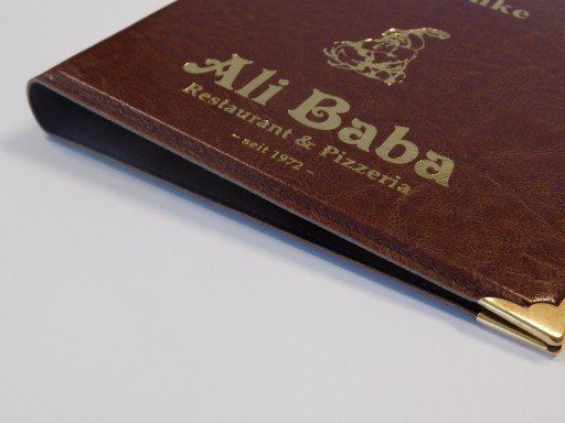 - standardowo okładka ma złocony lub srebrzony napis MENU (do wyboru zgodnie ze zdjęciem poniżej, lub BRAK takiego napisu). Możemy również bez dodatkowych opłat wykonać napis MENU w innym kroju pisma (przed wykonaniem wysyłany jest projekt).