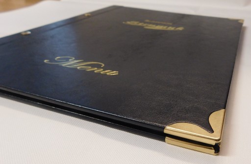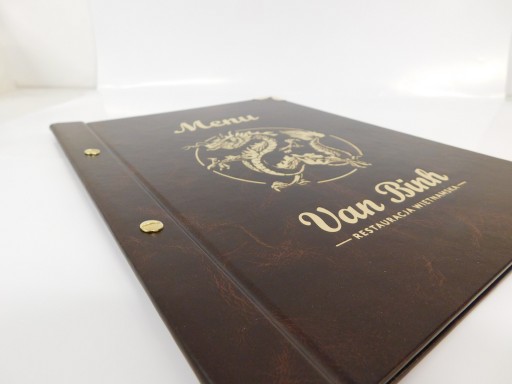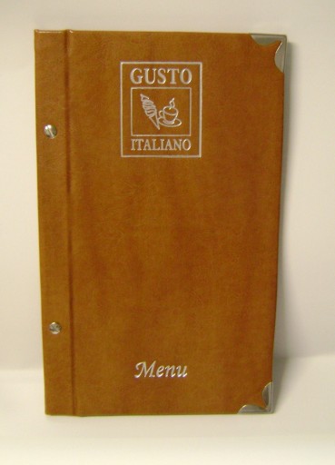 - standardowo okładka ma złocony lub srebrzony napis MENU (do wyboru zgodnie ze zdjęciem poniżej, lub BRAK takiego napisu). Możemy również bez dodatkowych opłat wykonać dowolny napis, czy też logotyp restauracji (przed wykonaniem wysyłany jest projekt okładki przygotowany z przesłanych materiałów).