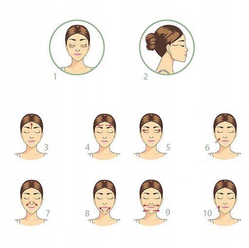 Poruszaj się od środka twarzy - nosa, przez policzek, w górę do obszaru węzłów chłonnych znajdujących się przed uchem. Powtórz ruch w linii poniżej.