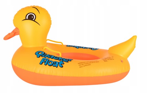 ✅ Dmuchany żółto-pomarańczowy materac w oryginalnym kształcie kaczuszki pełni funkcje pontonika dla dzieci.