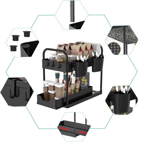 ❇️Dwuwarstwowa konstrukcja zapewnia więcej miejsca do przechowywania, a każda półka ma 4 odłączane haczyki i 2 wiszące umywalki, na których można wieszać kubki, ręczniki, noże itp., aby zachować porządek i porządek.