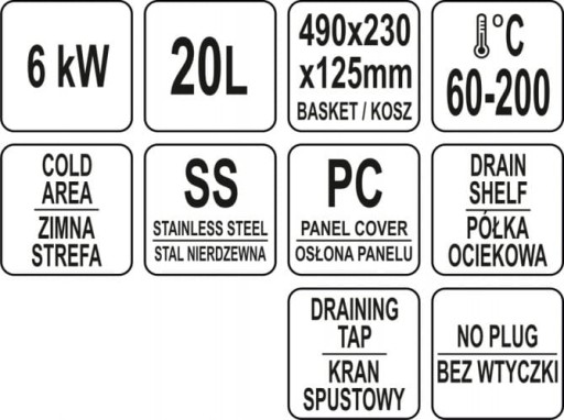 Smażalnik YATO posiada bardzo wytrzymały kosz o wymiarze 270x480x90mm z bocznymi uchwytami. Natomiast specjalne zaczepy umożliwiają powieszenie kosza bezpośrednio nad zbiornikiem, minimalizując ryzyko zachlapania olejem blatu roboczego. Dzięki temu znacznie zwiększa się czystość stanowiska pracy i minimalizuje czas potrzebny na czyszczenie. Dodatkowo smażalnik posiada boczny ociekacz, na którym można odstawić do ostygnięcia i ocieknięcia usmażone produkty.