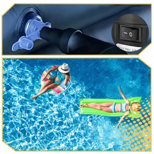 Pompka elektryczna z dwoma zasilaczami pozwoli Ci na bezproblemowe nadmuchanie materaca, piłki i basenu nie tylko w domu, ale także w podróży.