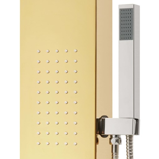 Wielofunkcyjny, złoty panel prysznicowy prezentuje stylowy design, dzięki czemu będzie doskonałym uzupełnieniem Twojej łazienki. Panel prysznicowy wykonano z wytrzymałej stali nierdzewnej o złotym, lustrzanym wykończeniu i ma piękny, kwadratowy kształt. Zawiera cztery funkcje: deszczownicę, wodospad, dysze masujące oraz ręczną słuchawkę prysznicową, które można w łatwy sposób wybierać za pomocą pokrętła. Zanurz się pod prawdziwie relaksującym prysznicem oraz ciesz się nowoczesnym stylem tego pięknego panelu prysznicowego!