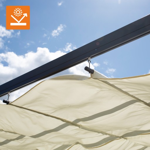 Pergola została wyposażona w praktyczne, przesuwane zadaszenie, które pozwala dostosować ilość cienia i światła do aktualnych potrzeb. Dzięki płynnemu mechanizmowi sterowania możesz w prosty sposób regulować położenie dachu, zapewniając sobie ochronę przed słońcem lub otwierając przestrzeń na świeże powietrze. To rozwiązanie sprawia, że pergola jest niezwykle funkcjonalna – idealna zarówno na upalne dni, jak i wieczorne spotkania na tarasie.