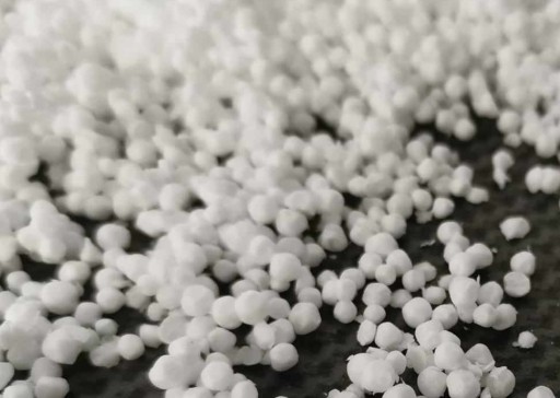 Regranulat z przemiału styropianowego bez zanieczyszczeń. Jest zapakowany w worek i pudełko kartonowe.