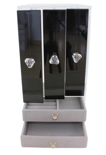 - Efektowny stojak na biżuterię z trzema wysuwanymi, pionowymi szufladkami.