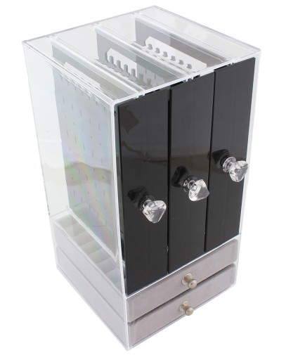 Praktyczny organizer na biżuterię z trzema wysuwanymi szufladkami, które umożliwiają zawieszenie bransoletek czy kolczyków w pionie. Posiada również dwie dodatkowe szufladki w dolnej części. Ekspozytor niezbędny każdej kobiecie, która chce zrobić porządek w swoich zbiorach bransoletek, zegarków oraz innej biżuterii i wyeksponować je w estetyczny sposób. Doskonale sprawdzi się również we wszelkich wystawach i witrynach sklepowych, u jubilera czy w lombardzie.