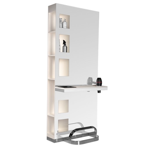 Nowoczesna konsola fryzjerska z dużym lustrem i podręcznymi półeczkami z obu stron. Zawartość półek z jednej strony są widoczne przez "okienka" Wykończenie najwyższej klasy. Elegancki i jednoczesnie uniwersalny element wnetrza, który podkresli charakter każdego salonu.