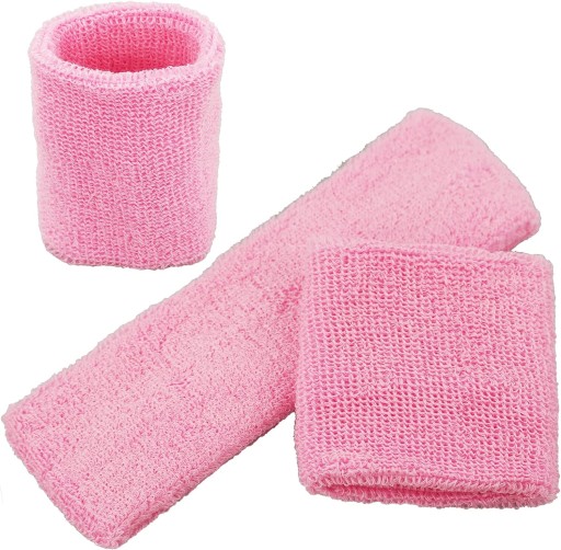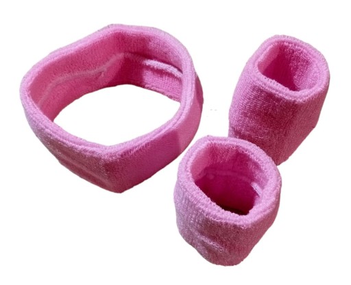 Różowe, elastyczne frotki i opaska na głowę to doskonały dodatek do domowego kostiumu trenerki fitness prosto z kasety VHS. Te sportowe elementy zapewnią komfort podczas szalonych tańców oraz uzupełnią każdą dresową/dyskotekową/fitnessową kreację w stylu lat 80 i 90.