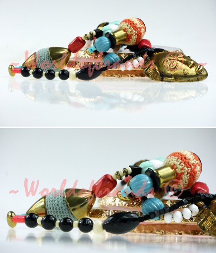 - Materiał: 5% Poliuretan Termoplastyczny + 5% Bawełna + 38% Crystal glass (szkło kryształowe) + 30% Żelazo + 20% Resin (Żywica) 2% Concha (Muszla)