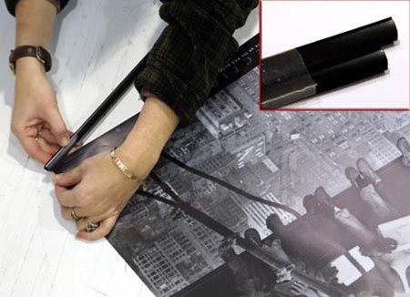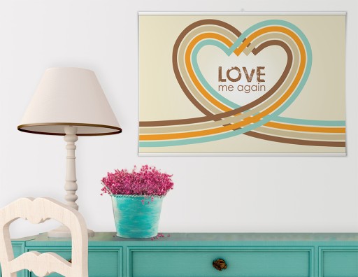 Wsuń listwę z oczkiem na górną krawędź plakatu, a drugą na dolną krawędź. Wbij gwoździk do ściany i powieś na nim plakat za pomocą oczka w górnej listwie i gotowe !