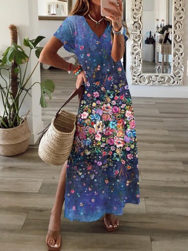 ❤ LETNIA DŁUGA SUKIENKA DAMSKA Z ROZCIĘCIEM ELEGANCKA WZORYW KWIATY❤