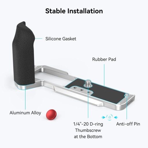 Uchwyt z łatwością blokuje aparat za pomocą śruby radełkowanej 1/4"-20 D-ring w dolnej części, gdzie znajduje się również wiele mocowań akcesoriów.