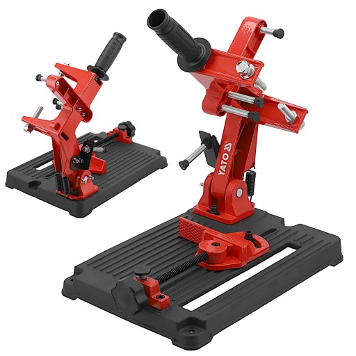 Uniwersalny statyw do pracy ze szlifierką kątową. Stabilna podstawa, wykonana ze staliwa, zintegrowana jest z mocnym imadłem szybkomocującym. Profile nośne o dużym przekroju i podwójna sprężyna powrotna umożliwiają pracę szlifierką o znacznej wadze. Poziomy kąt cięcia ustawiany jest precyzyjnie dzięki pokrętłom.