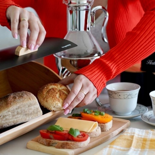 Konstrukcja umożliwiająca stabilne ustawienie na kuchennym blacie roboczym. Łatwy i komfortowy dostęp do pieczywa oraz zawartości trzech puszek dołączonych do kompletu. Lekki i wytrzymały – produkt powstał na bazie dobrej jakości stali węglowej oraz włókna bambusowego. Oryginalne wzornictwo wykorzystujące matowe wykończenie i niepowtarzalny kształt chlebaka. Solidna budowa odporna na przypadkowe zarysowania lub wgniecenia. Elegancki i jednocześnie nowoczesny. Zestaw higieniczny i bezproblemowy w utrzymaniu w czystości.