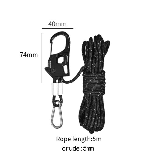 [Regulator samoblokujący]: Samoblokujący regulator ze stopu aluminium jest wyposażony w hak. Wystarczy delikatnie pociągnąć, zostanie mocno zamocowany i nacisnąć przełącznik, aby poluzować linę.
