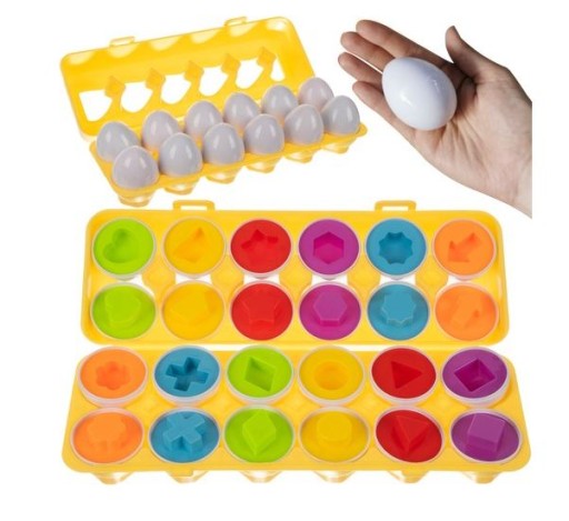 Jajka Montessori od marki WOOPIE to edukacyjna zabawka rozwijająca motorykę i koordynacje wzrokowo-ruchową dziecka. Zestaw zawiera 12 białych jajek w wytłoczce, które zachęcą do zabawy poprzez swoje kolorowe wnętrze w różnych kształtach. Zabawa polega na dopasowaniu ze sobą dwóch połówek jaj, tak aby utworzyły całość. Jajka należy dopasować zarówno kolorem jak i kształtem.
