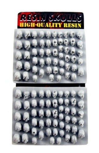 Każdy worek zawiera 100-105 żywicznych czaszek z luźnych, żywicznych czaszek wybranych losowo spośród 25 różnych rzeźb. Niektóre czaszki mogą mieć jedną stronę płaską, aby pomóc przy klejeniu do podstaw.