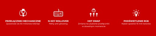 Wiemy jednak, że jako gracz możesz mieć własne preferencje, dlatego zaimplementowaliśmy Hot Swap - technikę, która pozwoli Ci wymienić dowolny 3-pinowy mechanizm na mikroprzełącznik firm takich jak: Outemu, Akko, KTT. Po prostu wyciągnij zamontowany mechanizm i wepnij nowy. Dzięki systemowi Hot Swap nie musisz też kupować nowej klawiatury, kiedy jeden przełącznik ulegnie awarii. Wymienisz go w kilka sekund.