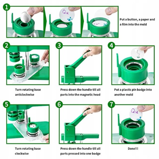 Notatka: Pomiar ręczny będzie miał błąd 1 i (8209; 2 cm) 1. Użyj noża, aby przyciąć obraz do odpowiedniego rozmiaru. 2. Umieść dolną i górną formę odznaki na maszynie guzikowej. 3. Włóż metalową górną pokrywę odznaki do formy górnej pokrywy, a następnie umieść zdjęcie. 4. Umieść folię ochronną na zdjęciu i obróć przezroczystą ramkę tak, aby lewa forma obróciła się w prawo 5. Umieść dolną kartę na dolnej pokrywie formy (stroną dolną do góry) i naciśnij uchwyt 6. Obróć przezroczystą ramkę, ustaw prawą formę z powrotem w lewo, naciśnij uchwyt