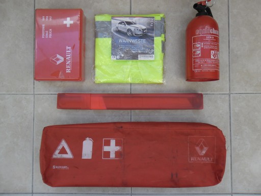 Zestaw - trójkąt ostrzegawczy + gaśnica + apteczka + kamizelka + etui do samochodu marki Renault