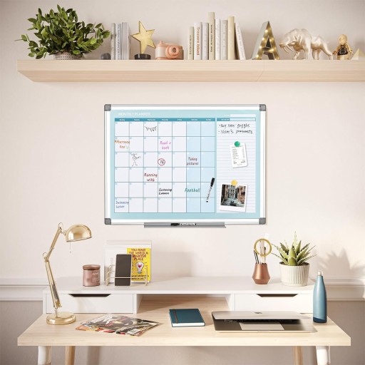 WYMIARY/ROZMIAR: Kalendarz jest dostępny w dwóch rozmiarach, 60 x 45 cm lub 90 x 60 cm. W tej ofercie otrzymasz obydwa!. PRZEGLĄD WAŻNYCH SZCZEGÓŁÓW: Tablica kalendarza z aluminiową ramą jest po prostu idealna do domu, biura, miejsca pracy, biurka, klasy, szkoły, uczelni, akademika, kuchni, przebieralni, pokoju dziecięcego lub każdego innego miejsca. Pomoże Ci to zorganizować wszystkie codzienne zadania. Zorganizuj swoje zadania domowe, zaplanuj tydzień, prowadź listę zakupów, zaplanuj menu posiłków itd. Łatwy montaż: dzięki prostemu systemowi montażowemu z czterema narożnikami pasuje do każdego otoczenia. W zakres dostawy wchodzą również 4 ruchome haczyki do zawieszania, które można przymocować na górze ramy, aby zawiesić tablicę. Nigdy nie przegapisz daty: dzięki smukłemu, prostemu i sensownemu wzornictwu oraz czterdziestu dwóm polom do oznaczania każdego dnia, ten miesięczny kalendarz z suchą gumką jest idealny do planowania ważnych codziennych wspomnień, list rzeczy do zrobienia i organizowania życia. Po prawej stronie można nawet zaznaczyć swoje zadania i notatki na następny miesiąc. Deska z materiału najwyższej jakości: wyprodukowana z magnetycznej lakierowanej stali i kartonu z ramą aluminiową 12 mm. Cała tablica kalendarza jest bardziej wytrzymała i trwała. Magnetyczna powierzchnia do pisania jest łatwa do usunięcia, dzięki czemu można aktualizować informacje w ciągu dnia.