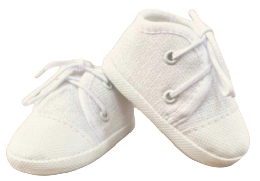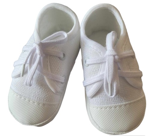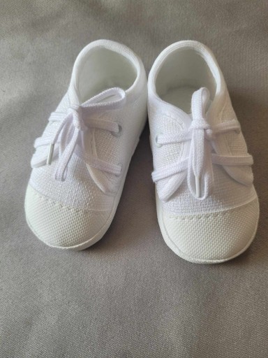 Buciki wiązane z białej tkaniny o grubym splocie.