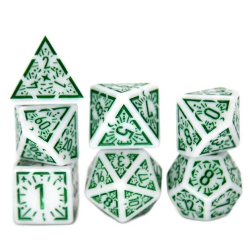 Komplet kości, czyli siedem wysokiej jakości kostek. Dzięki odpowiedniemu wyważeniu są bardzo wygodne w użyciu.
