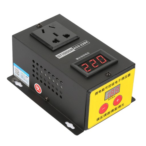 Specyfikacja:Model produktu: GT10000WSterowany model: BTA100-800B (importowany) STMicroelectronicsNapięcie wejściowe: AC220VNapięcie wyjściowe: regulacja ac 10-220 v (napięcie wyjściowe mniejsze niż napięcie wejściowe)Moc graniczna: 10000 W (moc graniczna obciążenia rezystancyjnego, zalecana do użytku w ciągu 5000 W przez długi czas w temperaturze pokojowej)Regulacja napięcia: 0-100% (regulacja nieliniowa przy 220 V i 100 stopniach)Prąd znamionowy: 25APrąd graniczny: 45AWaga: około 527 g / 18,6 uncji