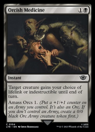 - Tekst karty: Target creature gains your choice of lifelink or indestructible until end of turn. Amass Orcs 1. (Put a +1/+1 counter on an Army you control. It's also an Orc. If you don't control an Army, create a 0/0 black Orc Army creature token first.)