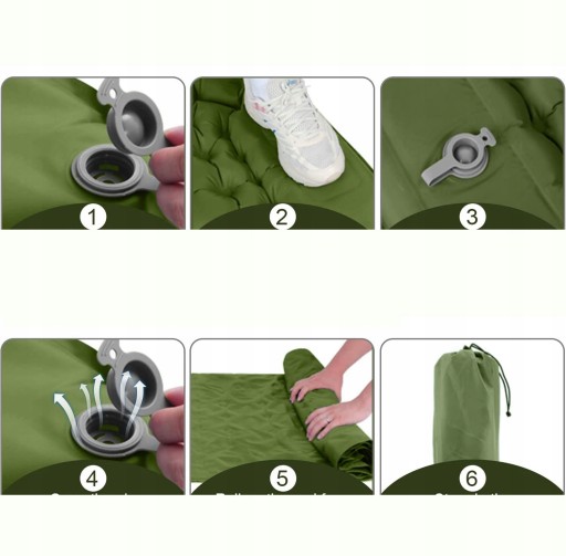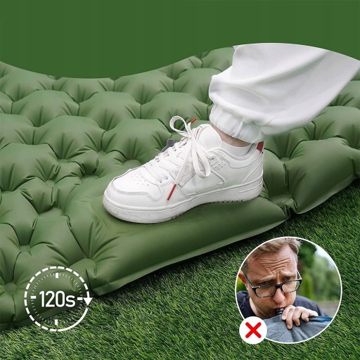- -Dzięki ulepszonej szybkiej pompie inflacyjnej podkładka izolacyjna kempingowa może być napompowana przez nacisk stopy lub dłoni. Wszystko, co musisz zrobić, to tupać wbudowaną pompką powietrza w dolnej części karimaty przez 120 sekund, aby nadmuchać i otworzyć nadmuchiwaną zatyczkę na poduszce na 3 sekundy superszybkiego spuszczania powietrza.