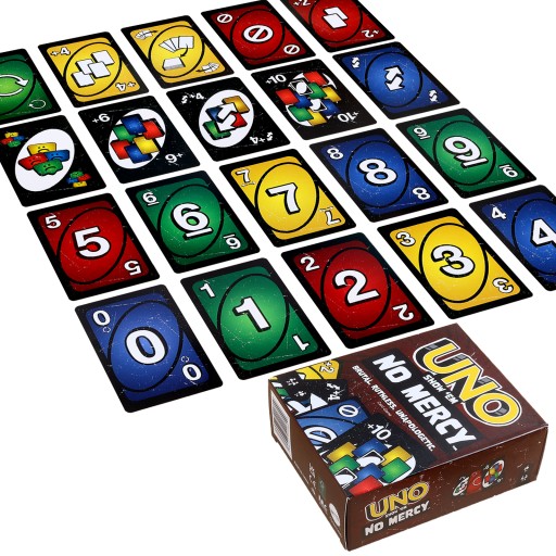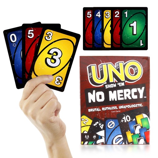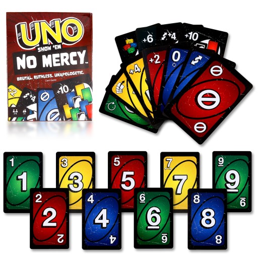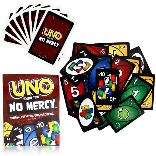 ✅UNO No Mercy Bez litości to najbardziej bezwzględna wersja UNO™! Ma o wiele więcej kart i dużo surowsze kary (dobieranie 10 kart to wyzwanie!)
