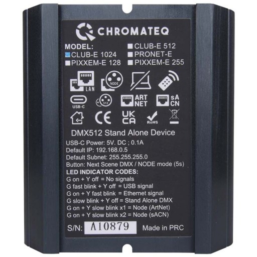 Chromateq Club 1024 to ✅ profesjonalny zewnętrzny interfejs DMX, pozwalający spiąć w jeden system reflektory sceniczne, ruchome głowice estradowe, efekty świetlne, a także urządzenia do wyrzucania konfetti, wytwornice dymu, baniek oraz inne maszyny scenotechniczne z wejściem DMX i sterować nimi za pomocą panelu kontrolnego, konsolety, komputera, a nawet tabletu czy smartfona. Chromateq Club 1024 idealnie nadaje się do projektów, w których potrzebna jest duża liczba kanałów DMX. Sprawdza się w czasie pokazów dźwiękowych i świetlnych oraz występów na żywo, podczas których na scenie zachodzi konieczność jednoczesnej kontroli wielu urządzeń.