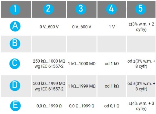 - wybierane napięcie pomiarowe: 250 V lub 500 V,