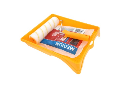 Praktyczny zestaw malarski przydatny przy typowych domowych remontach takich jak odświeżanie ścian czy sufitu.