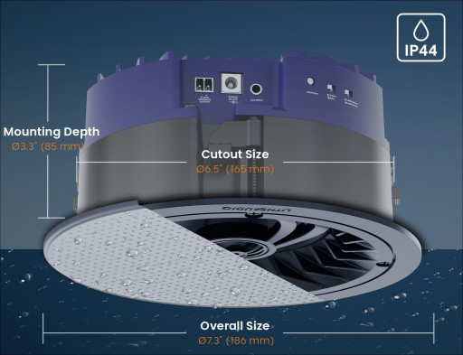 Głośnik sufitowy bluetooth Lithe Audio jest łatwy i szybki w montażu. W celu zamontowania urządzenia należy wywiercić otwór o średnicy 165 mm. Następnie połączyć przewód zasilający od zasilacza z głośnikiem oraz źródłem zasilania. Ostatnim etapem jest umieszczenia głośnika we wcześniej wywierconym otworze, zabezpieczenie za pomocą wkrętaka oraz założenie magnetycznej metalowej osłony grilla. Głębokość niezbędna do zabudowy urządzenia to 83 mm.