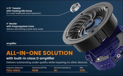 Głośnik jest w pełni zintegrowanym rozwiązaniem audio „All In One”, co oznacza, że w przeciwieństwie do innych znanych systemów dźwiękowych bezprzewodowych, nie musi być podłączony do oddzielnego wzmacniacza. Głośnik zapewnia doskonałą jakość dźwięku oraz jest łatwy do zainstalowania. Dostępny są w wersji z jednym głośnikiem bluetooth(proponowany na tej aukcji) lub parą. Zaprojektowane przez zespół inżynierów specjalizujących się w produktach z zakresu tzw. Inteligentnego domu. Bez ramowe głośniki tylko 3mm wystają z sufitu a sprytna magnetyczna pokrywa grilla może być szybko demontowana do czyszczenia lub wymiany na inny kolo.
