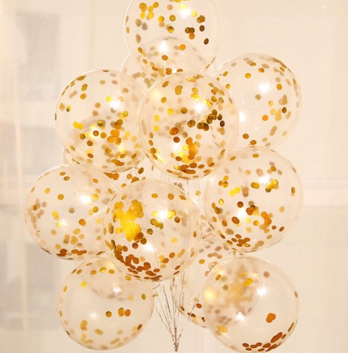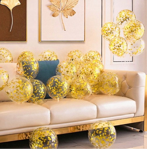 ❇️10 balonów transparentnych ze złotym konfetti - Przeźroczyste balony wypełnione złotym konfetti to doskonały sposób na wprowadzenie odrobiny magii i blasku. Wystarczy je napełnić helem lub powietrzem i cieszyć się ich efektem. Wielkość 30cm