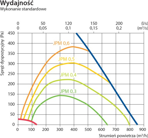 - JPM - 0,26 (W/m3/h), pobór mocy przez napęd wentylatora przy przepływie maksymalnym - 179 W.